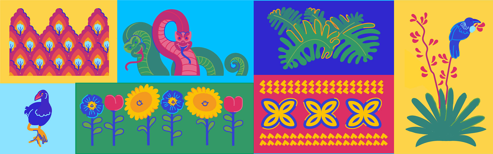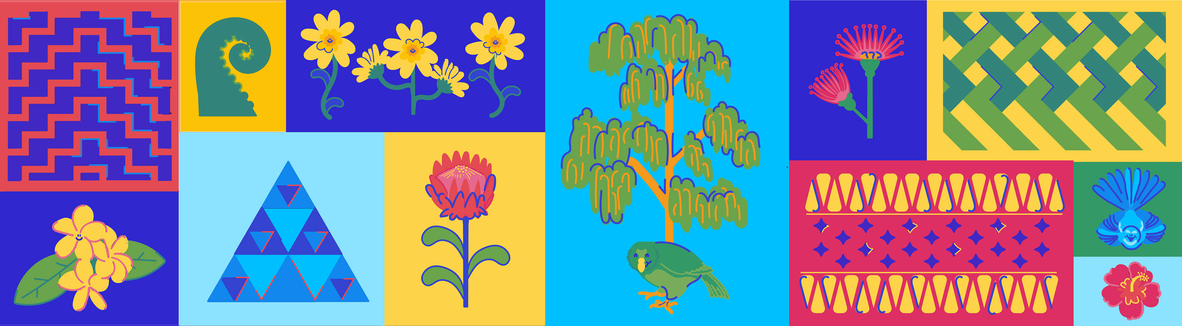 This multi-panel mural, composed of 19 unique illustrations, celebrates the rich culture and diversity of the Newtown community. Each panel acts as a window into a different place, depicting New Zealand cultural images while connecting and honoring many different heritages.